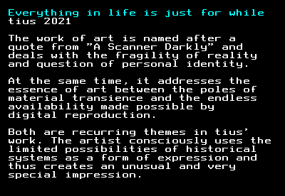 The works for the exhibition "Teletext is Art" once again address fundamental questions of human existence. For this purpose, film quotes of artificial intelligences were placed in a new context.